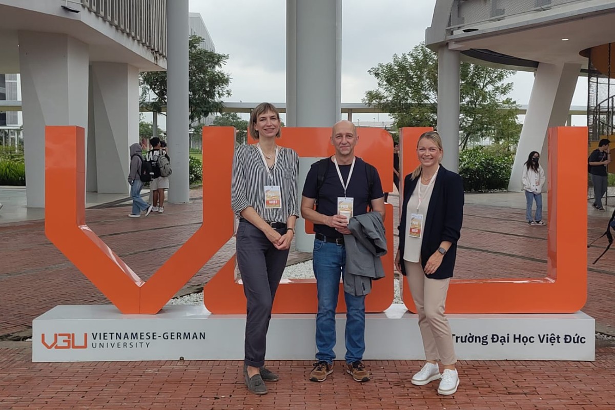 Das Foto zeigt Stephanie Schönfelder (links), Michael Ogurek und Corina Kleps während der Konferenz an der Vietnamese-German University in Binh Duong.
